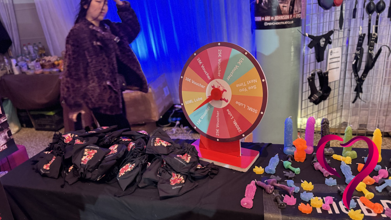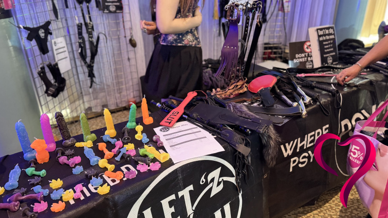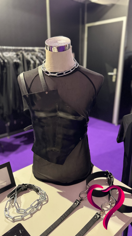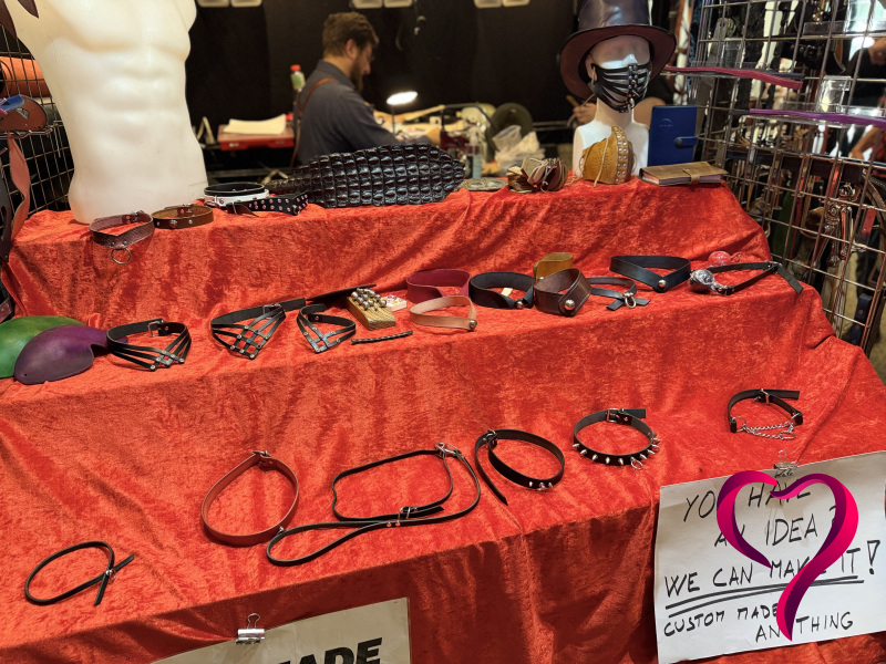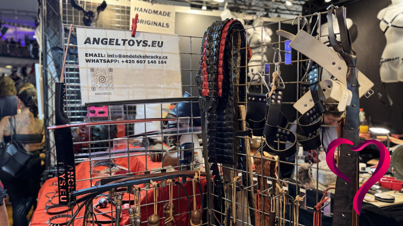 The Czech company Andělské hračky had a prominent stand right next to the Kinky stage. From what we observed, interested customers were asking about color options for harnesses, whips, and other leather items, but paradoxically, 95% of customers ended up purchasing the classic black version.