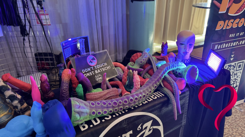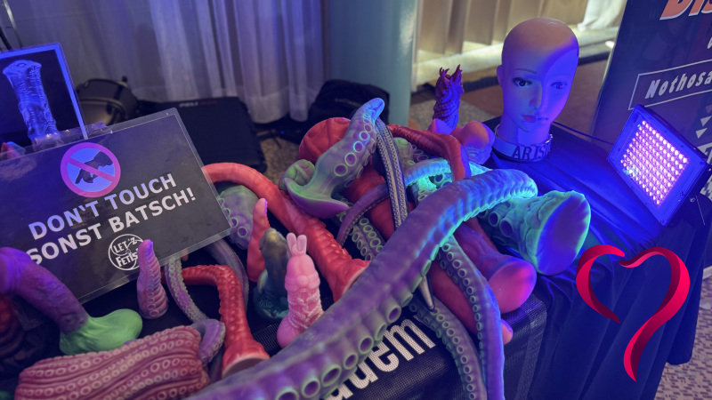 Did you know that there is a fetish for inflating and popping balloons? We did! We even have it in our glossary – “looner fetish” or simply Folikolism aka “looning”. But we didn’t expect the relatively large HerLoons.com booth, which combined large and relatively durable balloons with a pair of cheerful furries in full furry suits! They had chairs made of balloons that bounced and revealed a hidden dildo or massage head when you sat down.